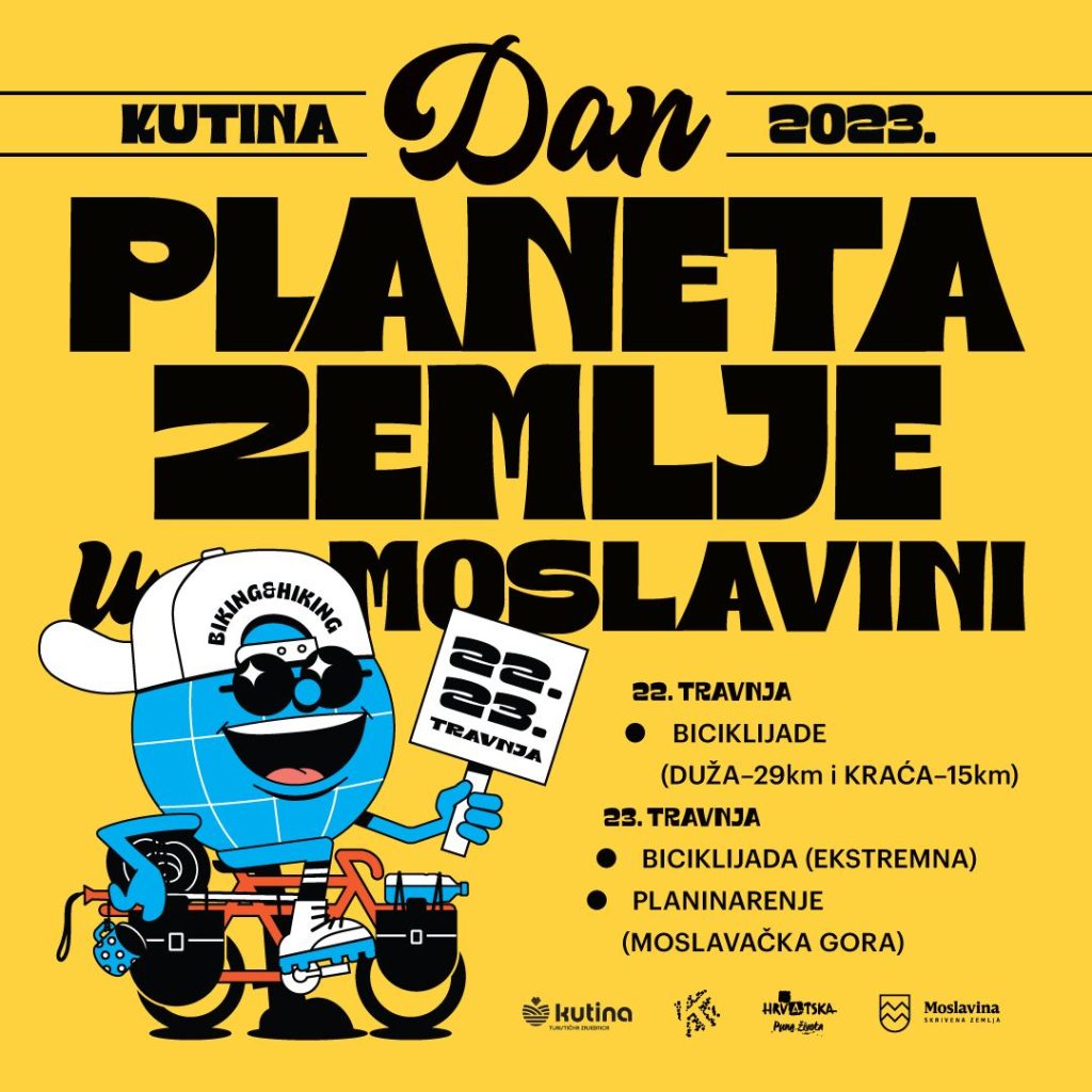 Turistička zajednica grada Kutine, Biciklistički klub Kutina i Planinarsko društvo Yeti Kutina vas pozivaju na veliku rekreativno-zabavnu manifestaciju „Dan planeta Zemlje u Moslavini“ koja se održava za vikend 22.4.-23.4.2023. u Kutini, a uključuje biciklijade i planinarenje u prekrasnom krajoliku Moslavine.